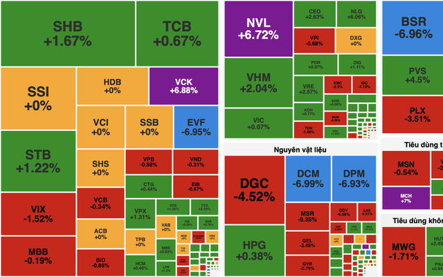 Trong nhóm cổ phiếu có thanh khoản lớn nhất thị trường, sắc xanh chiếm ưu thế. Một số mã tăng giá đáng chú ý gồm SHB, STB, FPT, NVL, HPG và VHM. Ngược lại, DGC, BSR và PVT đóng cửa trong sắc đỏ, còn SSI kết phiên tại mức tham chiếu.