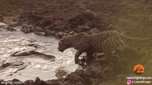 Báo hoa mai biến mất khỏi tầm mắt quan sát của nhóm du khách khoảng 10 phút. Sau đó, nó lại xuất hiện và tiến sát tới mép vũng nước. Những con cá đang vùng vẫy trong hố nước cạn là một bữa ăn vô cùng hấp dẫn.
