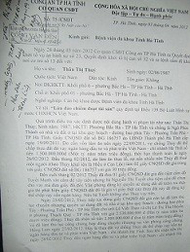 Để xác minh việc Thân Thị Thủy dùng giấy CNQSDĐ thế chấp, chuyến nhượng thật hay giả, cơ quan CSĐT công an thành phố Hà Tĩnh đã trưng cầu phòng Kỹ thuật hình sự công an Hà Tĩnh giám định. Kết quả cho thấy, giấy CNQSDĐ mà Thân Thị Thủy sử dụng để lừa bán nhà cho anh Thảo là giả.