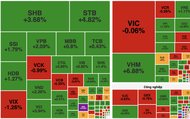 Nhiều cổ phiếu ngân hàng như STB, SHB, VPB, HDB hay MBB duy trì đà tăng, trong khi nhóm chứng khoán ghi nhận sắc xanh lan tỏa ở SSI, VND, VCI hay HCM.