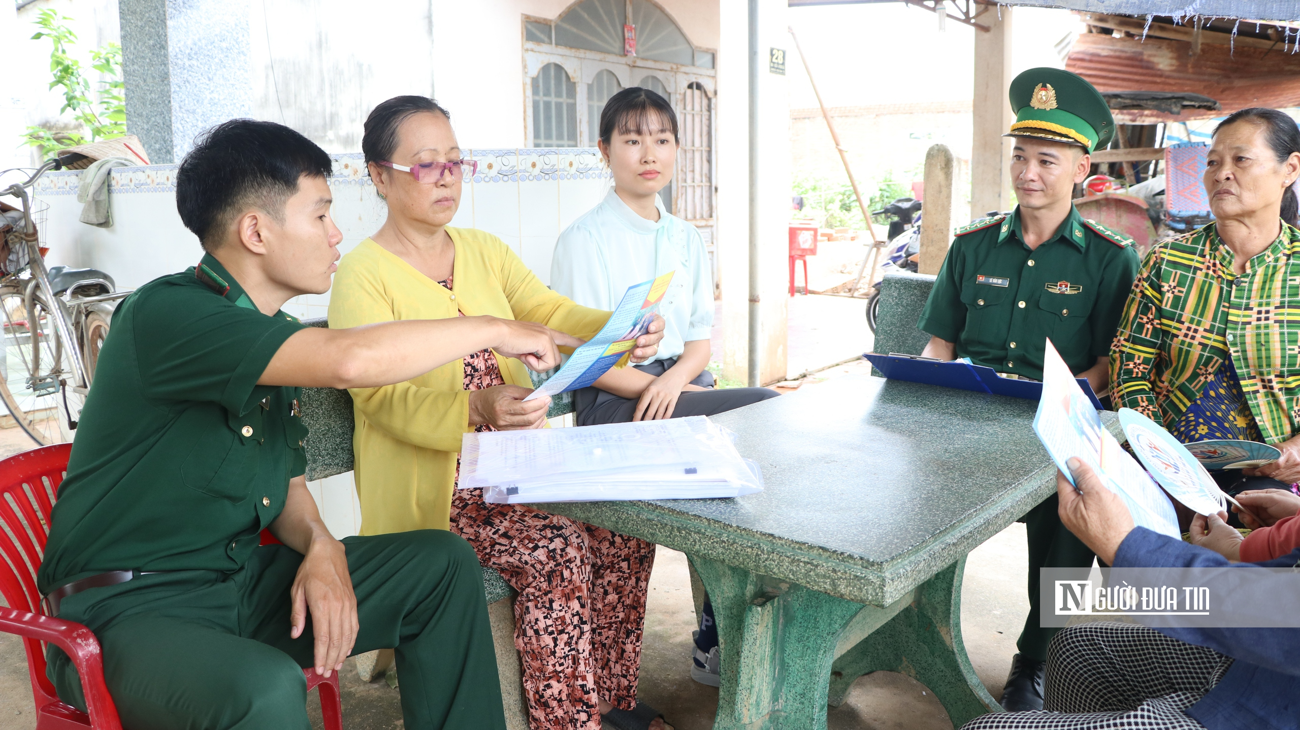 Cán bộ, chiến sĩ Đồn Biên phòng Vàm Trảng Trâu tuyên truyền cho người dân về phương thức, thủ đoạn của tội phạm mua bán người.