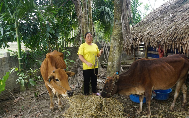 Bà Trương Thị Luyến (thôn Chẻ Dài) vui vẻ chăm sóc cặp bò mới nhận, từ cắt cỏ, gom rơm đến dọn chuồng. "Gia đình nghèo, giờ có bò, tôi coi như có cần câu cơm rồi", bà nói.