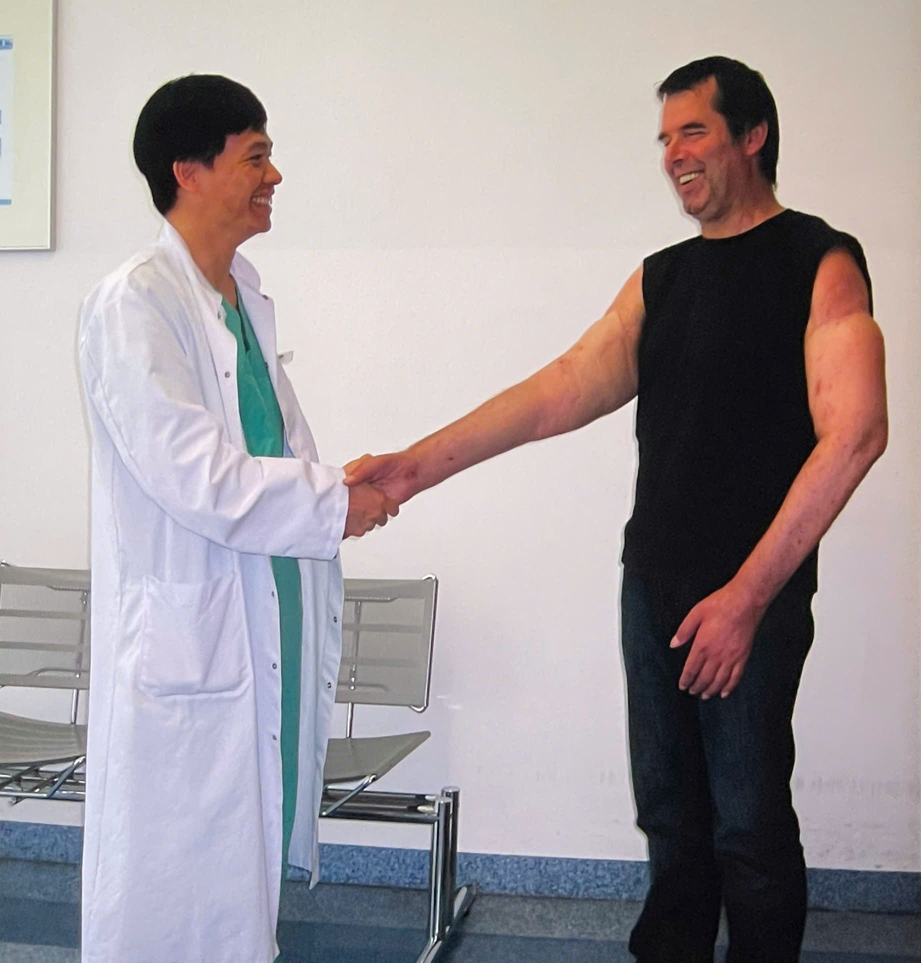 GS. Hoàng đã thực hiện thành công ca ghép đồng thời 2 cánh tay đầu tiên trên thế giới cho một công dân Đức bị cụt cả hai cánh tay (Ảnh: NVCC).