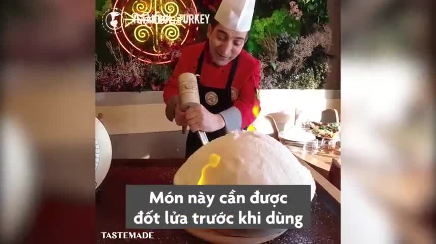 Để phá vỡ lớp vỏ, đầu bếp cần phải cho lửa bùng lên rồi đập vỡ lớp muối sau đó thưởng thức. Nếu món này chưa đủ để lấp đầy dạ dày bạn thì có đến cả tảng kebab khổng lồ đang chờ đón bạn thưởng thức.