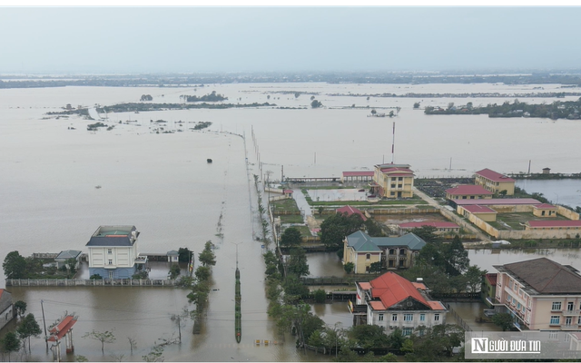 Theo ghi nhận, vào chiều ngày 18/11, trụ sở các đơn vị như Toà án nhân dân, bảo hiểm xã hội, công an xã… nằm trên địa bàn xã Quảng Điền (Tp.Huế) vẫn còn ngập nước xung quanh. Nhìn từ trên cao, những trụ sở này như những “ốc đảo” giữa vùng ngập.