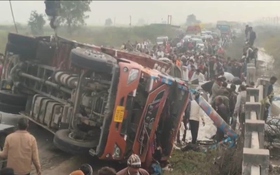 Xe tải chở bông lật đè trúng người đi bộ, 12 người thương vong