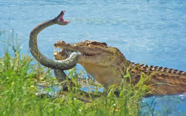 Trăn khủng đau đớn khi bị cá sấu quăng quật, tấn công trên sông