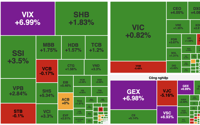 Ngân hàng cũng khởi sắc với SHB (+1,83%), VPB (+2,84%), HDB (+1,57%), TCB (+1,2%), MBB (+1,57%), ngoại trừ STB (-0,1%) và VCB (-0,17%) giảm nhẹ.