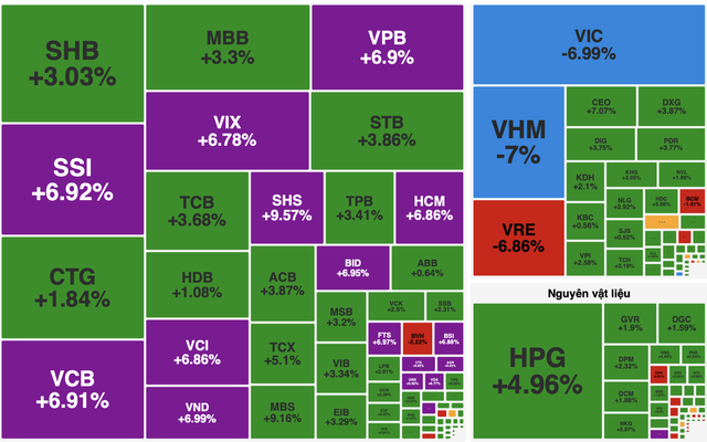 VN-Index bùng nổ thanh khoản hơn 41.000 tỷ đồng, cổ phiếu ngân hàng chìm trong sắc tím