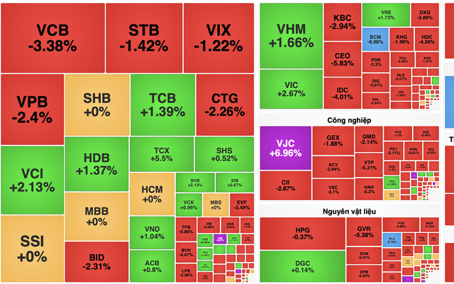 Xét theo nhóm ngành, bất động sản có điểm sáng từ bộ ba VIC, VHM và VRE giữ được sắc xanh, song phần lớn cổ phiếu còn lại chịu áp lực bán mạnh. BCM giảm sàn, CEO giảm khoảng 6%, các mã như IDC, HDC giảm quanh 4%, trong khi KDC, PDR, KHG, DXG, DIG và NVL đồng loạt điều chỉnh.