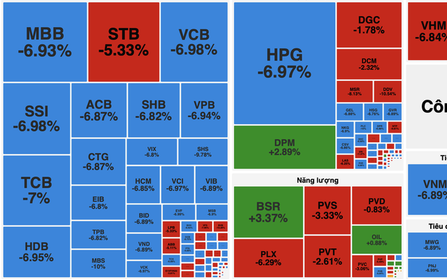 Sắc đỏ nhanh chóng chiếm ưu thế ở phần lớn các nhóm cổ phiếu, đặc biệt là các mã vốn hóa lớn. Nhiều cổ phiếu trong rổ VN30 rơi xuống mức giá sàn, góp phần kéo chỉ số chung giảm sâu.