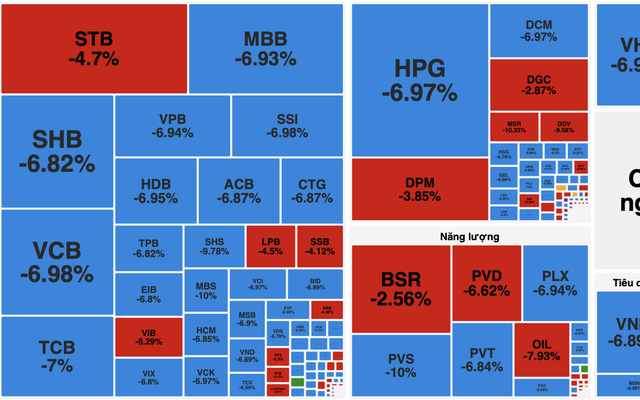 Áp lực bán diễn ra trên hầu hết các nhóm ngành. Tại nhóm ngân hàng, nhiều cổ phiếu giảm kịch biên độ như MBB, SHB, VCB, TCB, VPB, HDB, TPB, EIB, ACB, CTG và BID. Một số mã khác như STB, VIB và LPB cũng giảm mạnh.