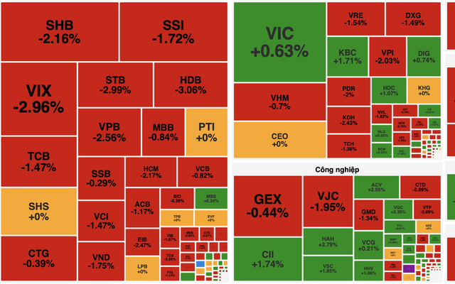 Áp lực bán mạnh nhất tập trung ở nhóm ngân hàng – trụ cột của thị trường. HDB giảm 3,06%, STB giảm 2,99%, VPB mất 2,56%, SHB giảm 2,16%.