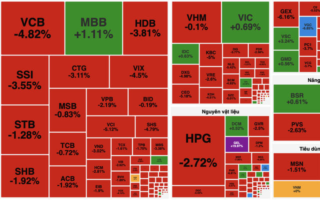 Nhóm nguyên vật liệu và công nghiệp cũng không nằm ngoài xu hướng chung. HPG giảm 2,72%, GEX mất hơn 6%, DGC giảm 3,55%.