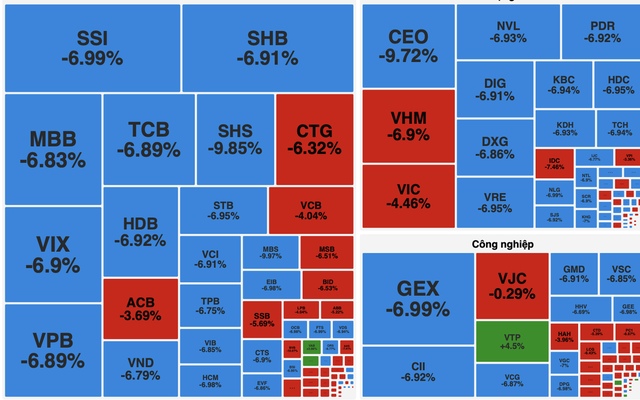 Làn sóng bán tháo không chỉ giới hạn ở nhóm vốn hóa lớn mà lan rộng trên toàn thị trường. Hầu hết các nhóm ngành từ ngân hàng, chứng khoán, bất động sản đến tiêu dùng, công nghiệp đều đồng loạt giảm sâu. Nhiều cổ phiếu như SHS, MBS, CEO, NKG hay ITA trắng bên mua.