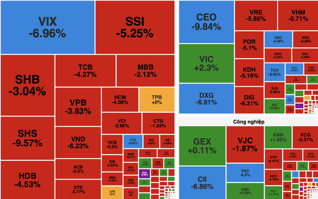 Nhóm bất động sản cũng chìm trong sắc đỏ, với 9 mã giảm sàn gồm CEO, DXG, TCH, NLG, DXS, HDC, CII, HHS, CTI. Nhiều mã lớn khác tiếp tục lao dốc như DIG (-6,3%), VRE (-5,9%), NVL (-5,5%), PDR (-5,1%). Dù vậy, cổ phiếu VIC vẫn giữ được đà tăng 2,3%, giúp chỉ số ngành bất động sản chỉ giảm nhẹ 0,2%.