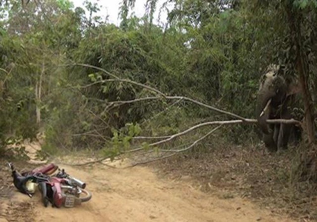 30 phút sau, trên 20 người dân đi làm rẫy qua khu vực này phải dừng lại vì voi đã làm đổ một gốc cây. Số lượng người đông và gây ồn ào đã làm voi kích động và bắt đầu phá hoại chiếc xe máy của anh Khang.