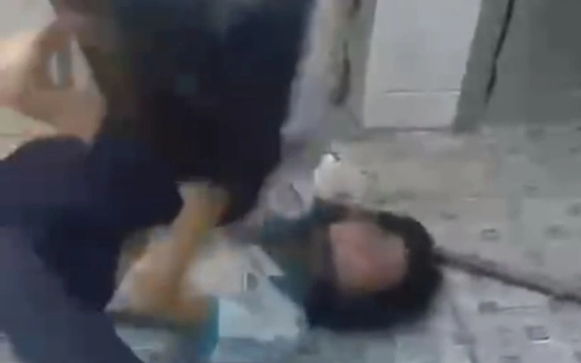 Hai nữ sinh đánh nhau trong nhà vệ sinh Trường THCS Phú An, Tp.HCM. Ảnh cắt từ clip.