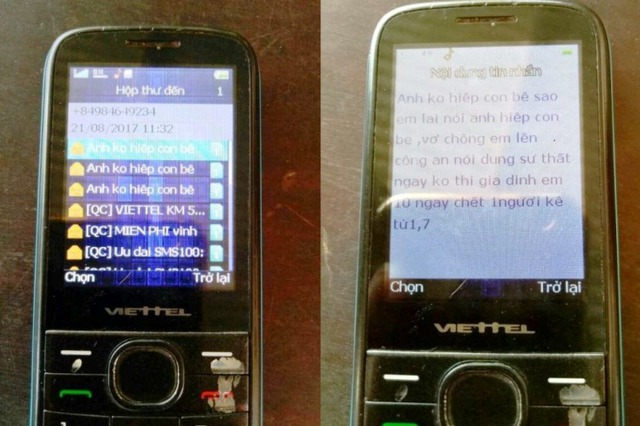 Cụ thể có 3 tin nhắn với nội dung tương tự: “Anh ko hiêp con bê sao em lai noi anh hiep con be , vơ chông em lên công an noi dung sư thất ngay ko thi gia dinh em 10 ngay chet 1ngươi kê từ1,7”. (PV - Anh không hiếp con bé sao em lại nói anh hiếp con bé, vợ chồng em lên công an nói đúng sự thật ngay không thì gia đình em 10 ngày chết 1 người...).