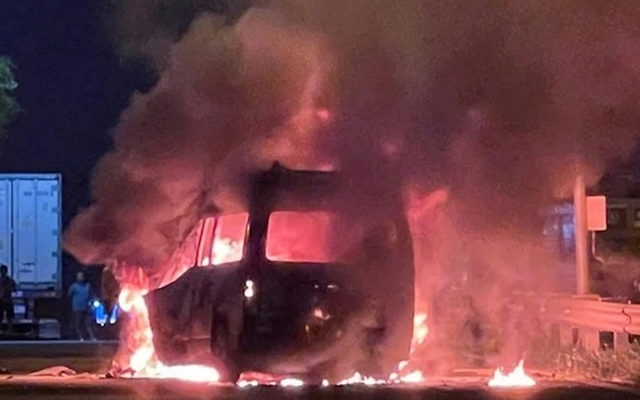 Sau va chạm, ô tô cứu thương đã bốc cháy, trên xe có 5 người, gồm: ông V.V.H. (SN 1950, trú tại Gia Lai); N.T.T.H. (SN 1973, người nhà bệnh nhân); bà N.T.L.A. (SN 1963, bệnh nhân); ông V.V.N. và tài xế xe cứu thương (chưa rõ danh tính).